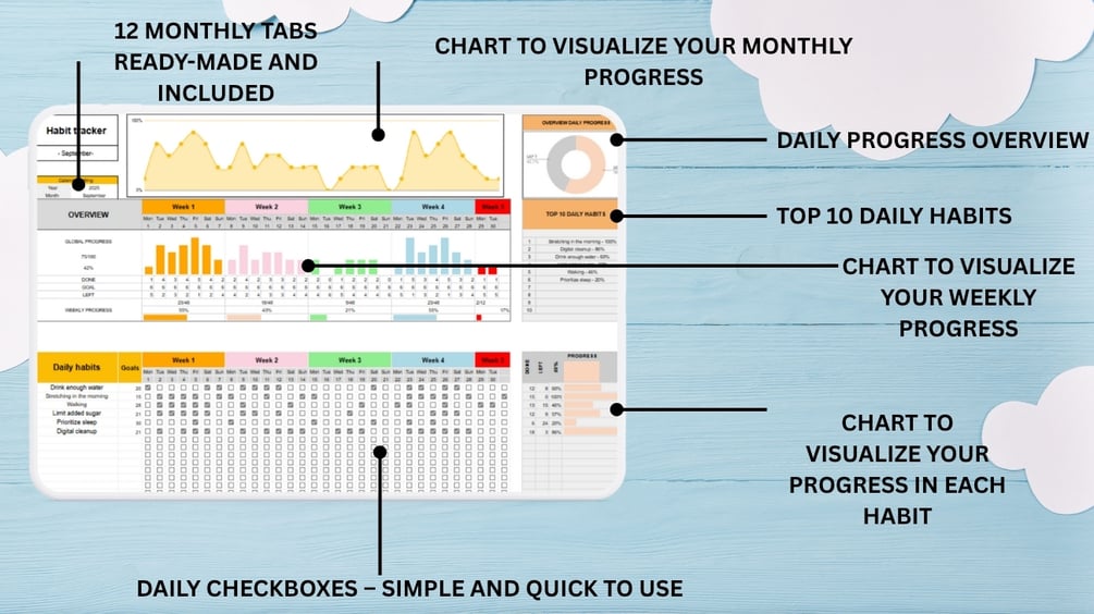 Each month has its own sheet, so you can compare daily, weekly, and monthly progress easily. -